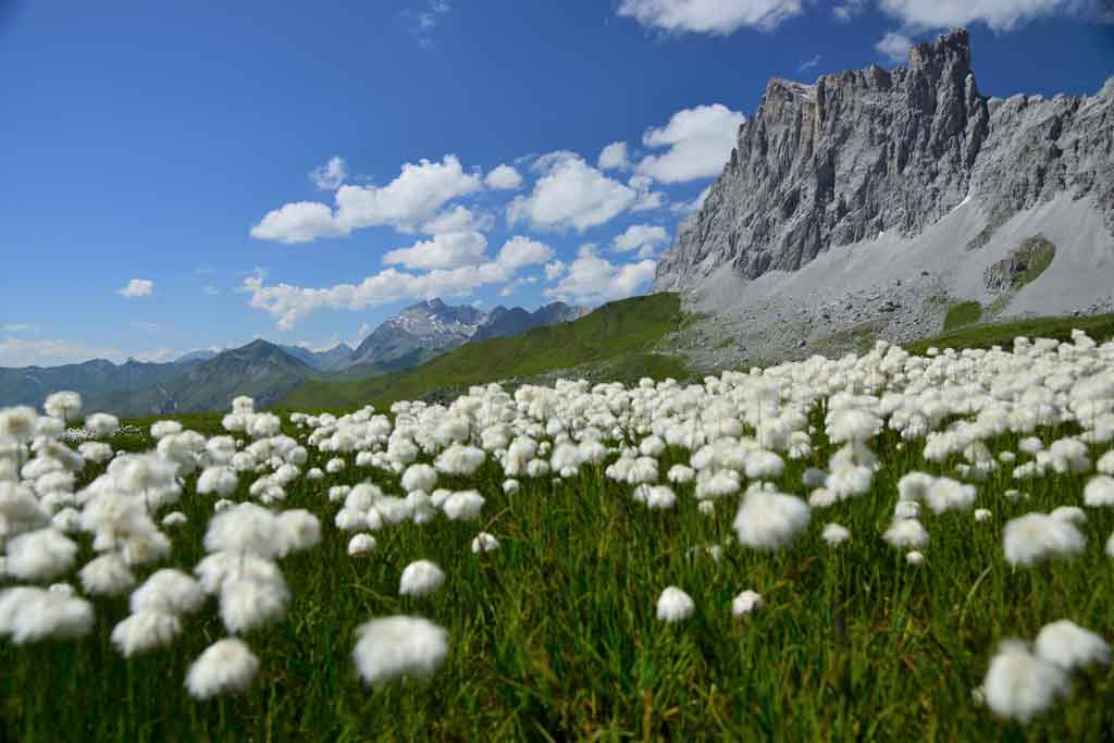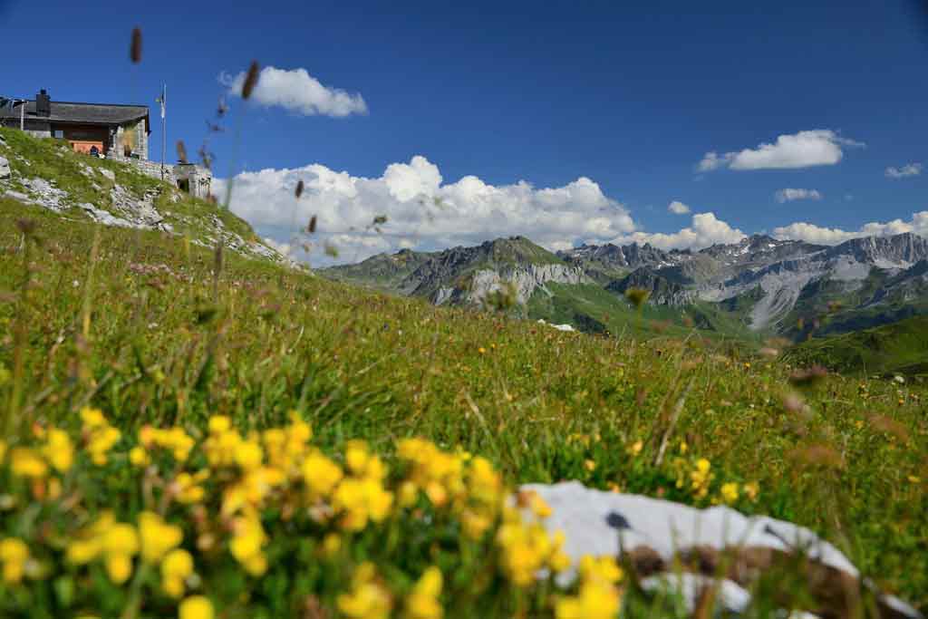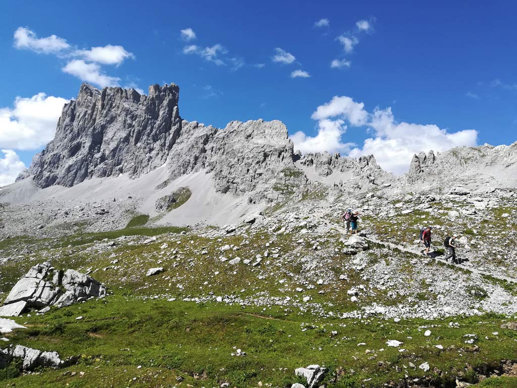 Es geht nach Graubünden. Wir starten Richtung Tilisunahütte. Diese lassen wir jedoch am Rand liegen und steigen auf Richtung Sulzfluh mit 2.818 m (Gipfel nur für trittsichere Geher). Von hier oben haben wir einen traumhaften Rundumblick – auch bis zurück zu unserem Startpunkt im Allgäu. Nach dem Abstieg erreichen wir bald die Carschinahütte (2.236 m) mit ihrer wunderschönen Lage oberhalb des Talkessels. Selbst im Hochsommer lässt sich hier oben eine grandiose Blumenpracht bewundern.
