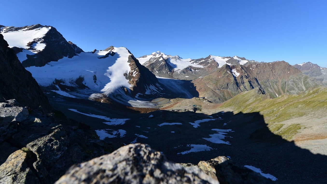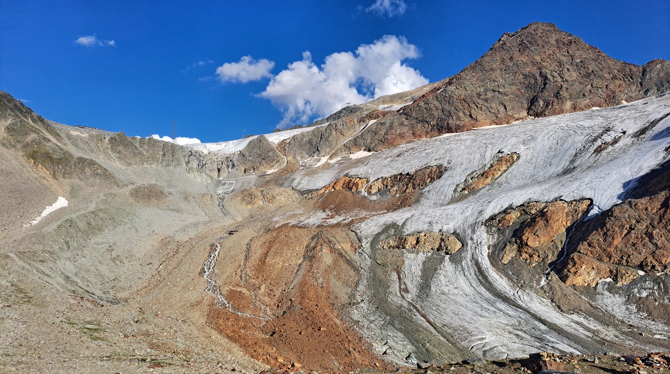 Erneut steht Dir ein langer Tag bevor. Der Weg führt Dich in der Früh hinauf auf das Rettenbachjoch. Dort besteht unter Umständen (Hochsommer ab ca. Mitte Juli) die Möglichkeit mit der Bahn hinab zur Talstation zu fahren. Alternativ wanderst Du über das Pitztaler Jöchel. Der Rundumblick in die noch immer vergletscherte Bergwelt mit der Wildspitze (zweithöchster Berg Österreichs) ist bei beiden Varianten nach wie vor atemberaubend. Unten an der Talstation angekommen nimmst Du den Bus zum Tiefenbachferner (fährt ca. alle 20 Minuten). Nun geht es auf dem einfachen Panoramaweg hinunter nach Vent (Einkehr möglich). Der Name ist Programm: die Blicke sind einfach grandios. Nach der Einkehr läufst Du auf einem recht flachen Fahrweg hinauf zur Martin-Busch-Hütte auf 2.501 m.